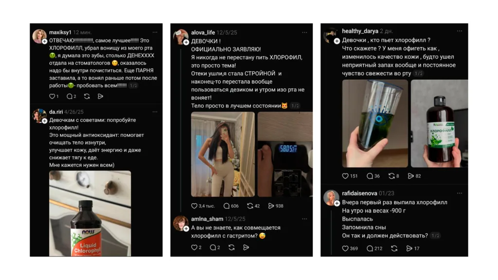 В социальной сети Threads всё чаще появляются публикации о «чудодейственных» свойствах хлорофилла. Пользователи активно делятся положительным опытом и утверждают, что добавка улучшает состояние кожи, устраняет неприятный запах тела и изо рта, способствует снижению веса и помогает избавиться от отёков.