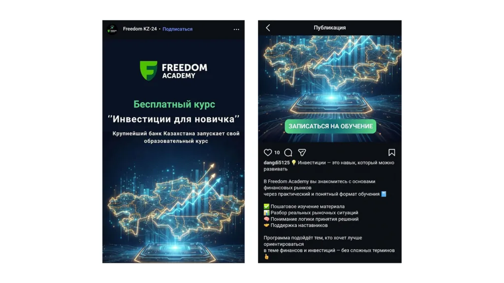 В социальной сети Instagram распространяется псевдореклама инвестиционного курса, который якобы организован Freedom Academy. Пользователям предлагают перейти по ссылке и «записаться на обучение». В публикации обещают познакомить участников с основами финансовых рынков «через практичный и понятный формат».