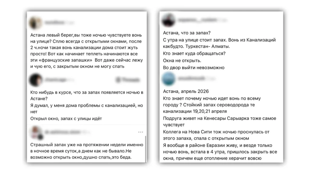 Айтуларынша, жағымсыз иіс әсіресе, түн уақытында қатты сезіледі. Қала әкімдігіне қарасты «Астана су арнасы» МКК аталған жайтқа түсініктеме берді. Ведомство хабарламасында, тұрғындар шағымынан соң жедел түрде тексеру жүргізілгені туралы мәлімделген.