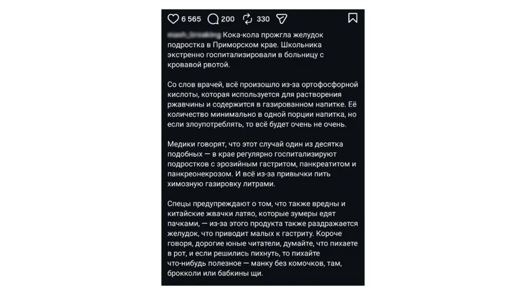 В социальных сетях распространилась тревожная информация о том, что в Приморском крае якобы известный газированный напиток «прожёг» желудок подростка. Сообщалось, что школьник был экстренно госпитализирован с кровавой рвотой. В публикациях причиной называли ортофосфорную кислоту, содержащуюся в напитке.