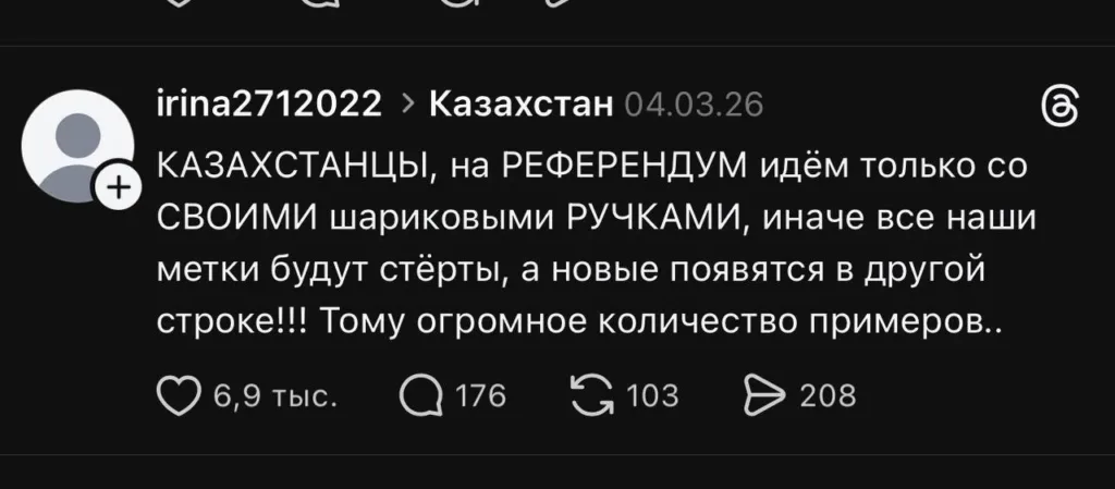 Один из пользователей сети Threads опубликовал видео с подписью «Волшебная ручка на выборах. Новый Казахстан». На кадрах видно, как человек на одном из избирательных участков пишет ручкой на белом листе бумаги, а затем стирает написанное с помощью пламени.