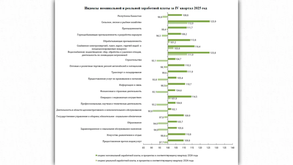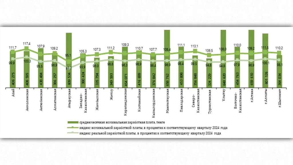 Наибольший рост среднемесячной заработной платы зафиксирован в сельском, лесном и рыбном хозяйствах (25,9%), а также в сфере операций с недвижимостью, транспорте, информационно-коммуникационной отрасли и торговле. Более умеренная динамика отмечена в образовании и здравоохранении — около 5 — 6%. В региональном разрезе лидерами по темпам роста стали Акмолинская и Северо-Казахстанская области, а также область Абай, Алматы и область Жетісу.