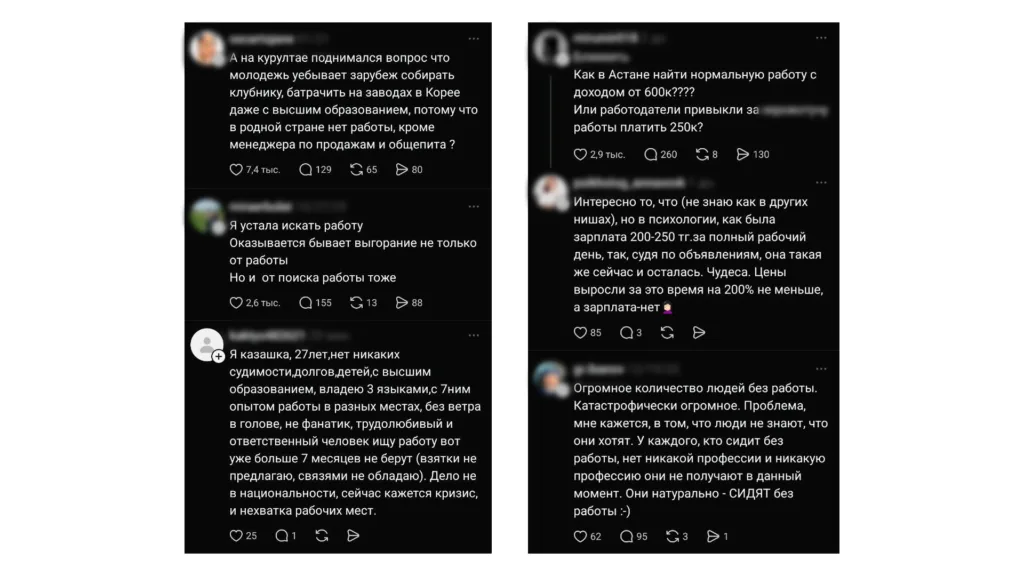 В социальных сетях не редко встречаются жалобы на дефицит рабочих мест в крупных городах Казахстана. Судя по публикациям и комментариям, даже наличие зарубежного диплома не гарантирует успешного трудоустройства. Пользователи также высказывают недовольство уровнем оплаты труда — как для выпускников иностранных вузов, так и для местных специалистов со знанием иностранных языков.